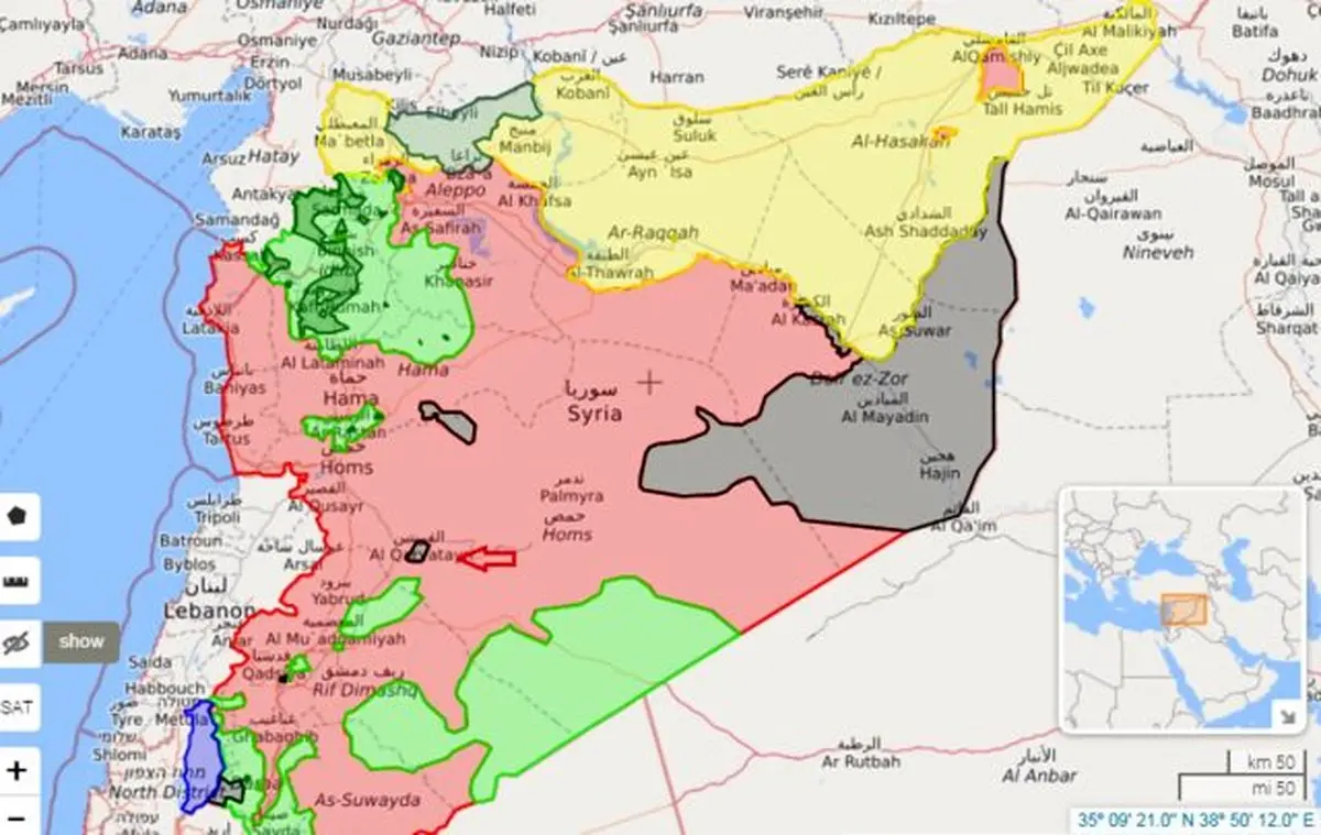 موقعیت شهر القریتین(توسی) در عمق مناطق تحت کنترل ارتش سوریه(قرمز)