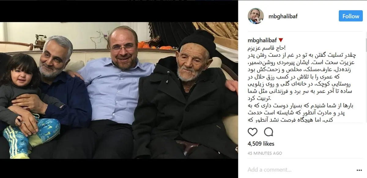 محمد باقر قالیباف شهردار سابق تهران با انتشار پستی در صفحه اینستاگرام Instagram خود فوت پدر سردار قاسم سلیمانی را تسلیت گفت و نوشت:"حاج قاسم عزیزم!
