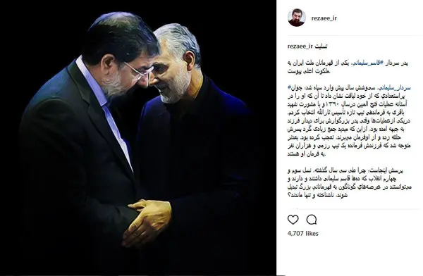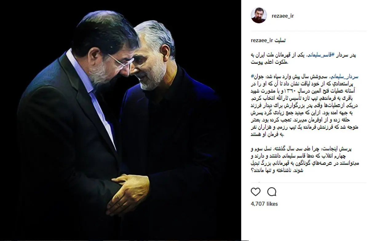 رکنا: محسن رضایی با انتشار پستی در اینستاگرام فوت پدر حاج قاسم سلیمانی را تسلیت گفت.
