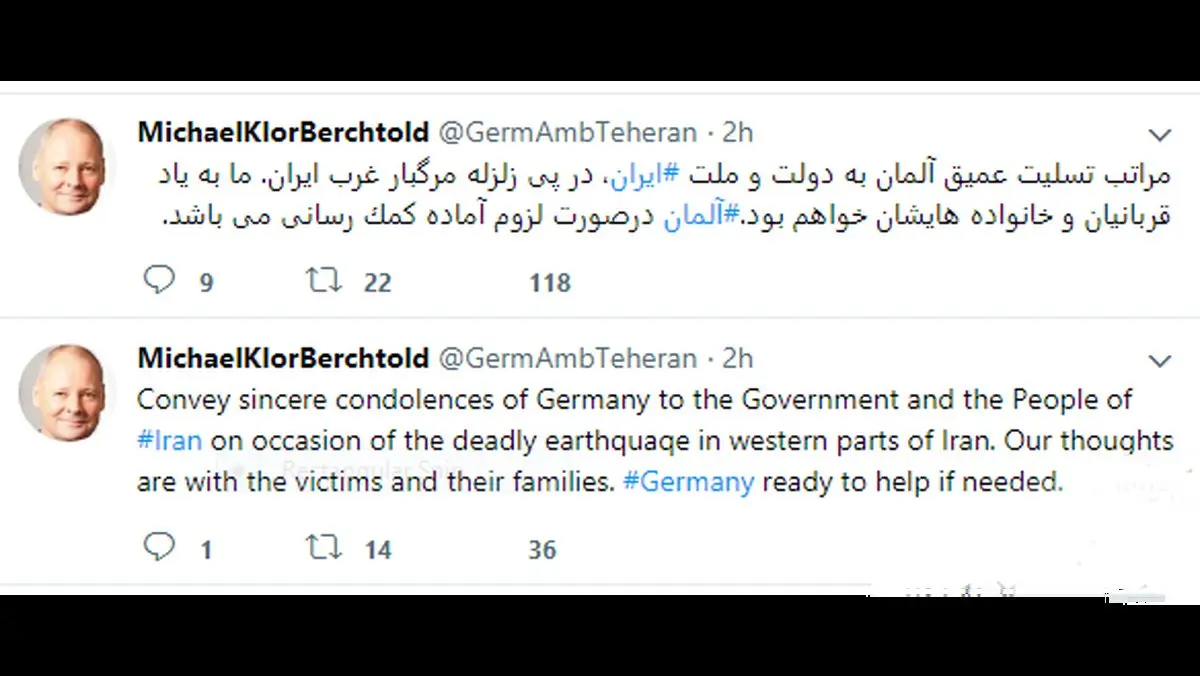 مایکل کلور برشتولد، سفیر آلمان در ایران، در پیامی به زبان انگلیسی و فارسی در صفحه توییتر خود نوشت: مراتب تسلیت عمیق آلمان به دولت و ملت ایران، در پى زلزله مرگبار غرب ایران. ما به یاد قربانیان و خانواده هایشان خواهیم بود. آلمان در صورت لزوم آماده کمکرسانى مى باشد.