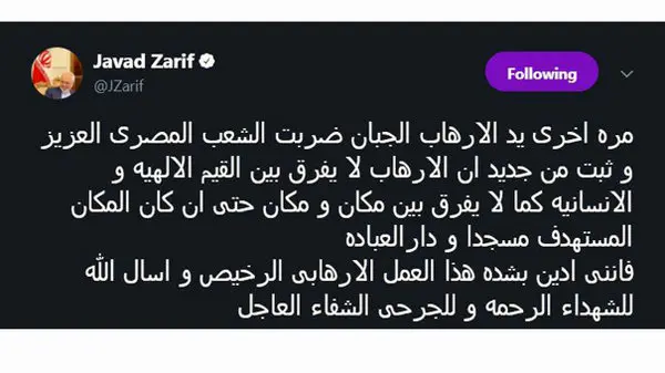 توییت عربی دکتر محمد جواد ظریف درباره حمله تروریستی به مسجد العریش مصر: یک بار دیگر دست بزدل تروریسم، ملت عزیز مصر را هدف قرار داد و دوباره ثابت شد که برای تروریسم ارزش های الهی و انسانی اهمیتی ندارد همان طور که بین مکان ها فرقی نمی گذارد حتی اگر مکان مورد حمله، مسجد و محل عبادت باشد