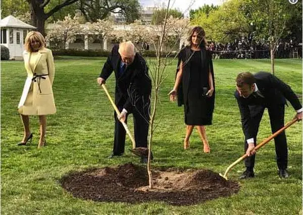 مکرون در سفر خود به آمریکا یک اصله نهال بلوط از یکی از صحنههای نبرد مربوط به جنگ جهانی اول در اطراف پاریس (که ارتش آمریکا در آن حمله آلمان نازی را دفع کرده بود) را به ترامپ Trump هدیه داد و با همراهی همتای آمریکایی خود و با حضور همسرانشان در مقابل دوربینهای خبرگزاریهای جهان این نهال را در فضای سبز کاخ سفید کاشتند.