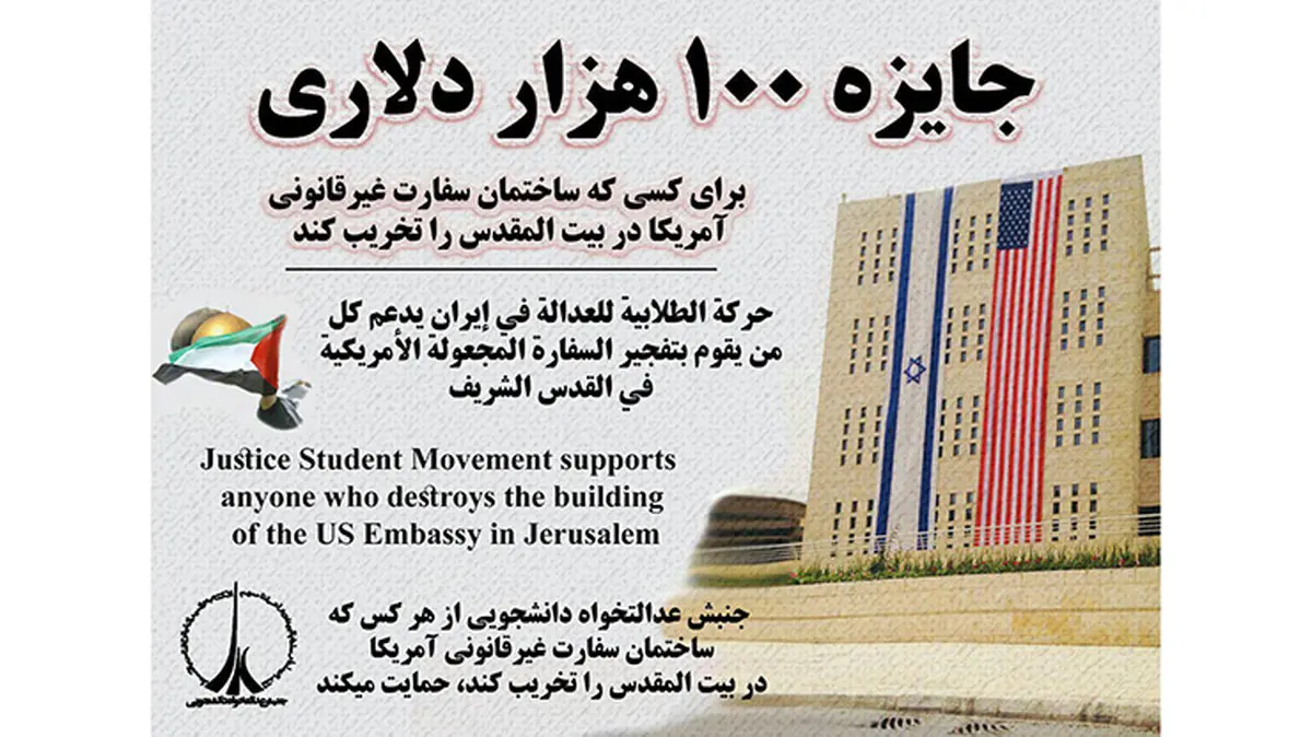 به دنبال انتقال سفارت آمریکا به قدس شریف، جنش عدالتخواه دانشجویی اعلام کرد که به منفجر کننده ساختمان این سفارتخانه غیرقانونی ۱۰۰ هزار دلار جایزه میدهد.