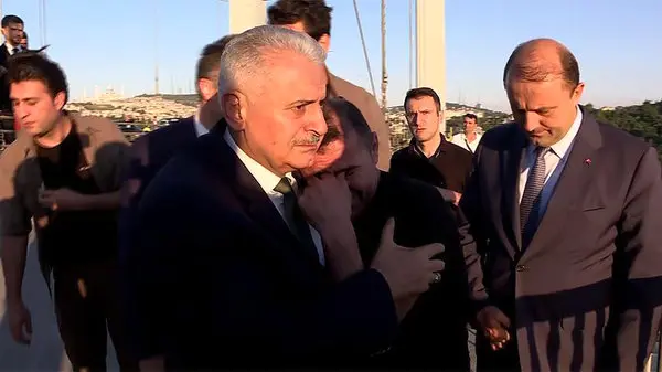 رکنا: بنعلی یلدریم، نخست وزیر ترکیه روی پل شهدای 15 جولای استانبول موفق شد جلو خودکشی یک مرد را بگیرد.