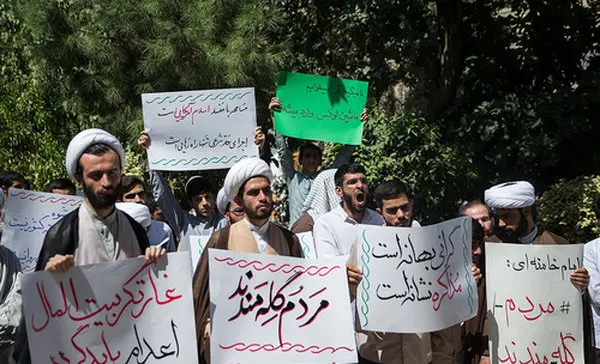 رکنا: جمعی از طلاب حوزه علمیه مروی واقع در بازار تهران روز شنبه در اعتراض به وضع اقتصادی موجود و احتکار کالاهای ضروری توسط برخی سوءاستفاده گران در محوطه این حوزه تجمع کردند و برخورد شدید قوه قضائیه با مفسدان را خواستار شدند.