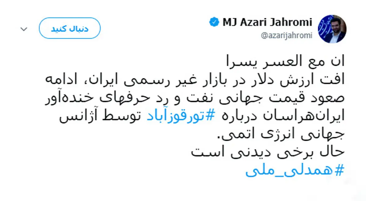 محمد جواد آذری جهرمی وزیر ارتباطات و فناوری اطلاعات در پست توییتری خود با اشاره به افت ارزش دلار ، به ادامه صعود قیمت جهانی نفت و صحبتهای نتانیاهو در خصوص برنامه صلح آمیز انرژی هستهای ایران واکنش نشان داد.