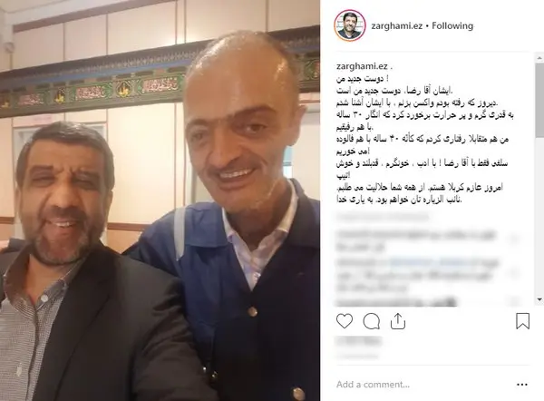 زت الله ضرغامی، عضو شورای عالی فضای مجازی با انتشار تصویری از خود و شخصی که آن را دوست جدید خود معرفی کرده، اعلام کرد که او نیز عازم کربلاست.