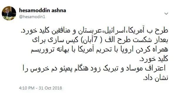 حسام الدین آشنا مشاور رئیس جمهور در حساب توئیتری خود نوشت: بعد از شکست طرح «الف» (۷ آبان) کیس‌سازی برای همراه کردن اروپا با تحریم غیرقانونی آمریکا با بهانه تروریسم کلید خورد. اعتراف موساد و تبریک زود هنگام پمپئو دم خروس را نشان داد.خلاص کردن عربستان از فشار بین المللی قتل Murder خاشقجی هدف دیگر این توطئه است؛ غافل از آنکه دست ایران پر است و موساد کیس سوخته را حراج کرده است.خواندنی های رکنا را در اینستاگرام دنبال کنید