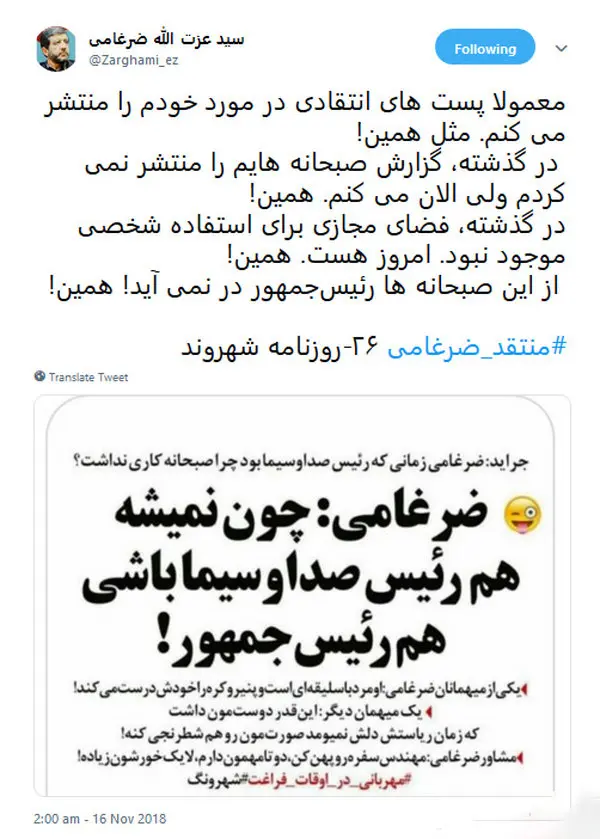 معمولا پست های انتقادی در مورد خودم را منتشر می کنم. مثل همین! در گذشته، گزارش صبحانه هایم را منتشر نمی کردم ولی الان می کنم. همین! در گذشته، فضای مجازی برای استفاده شخصی موجود نبود. امروز هست. همین! از این صبحانه ها رئیسجمهور در نمی آید! همین!اخبار 24 ساعت گذشته رکنا را از دست ندهید