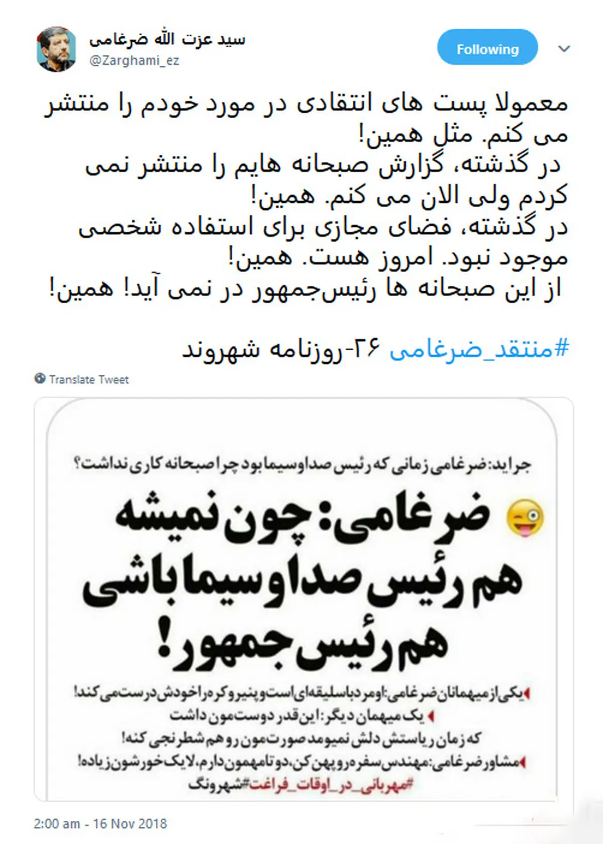 رکنا: رئیس اسبق رسانه ملی با انتشار توئیتی پاسخ منتقدان به تصاویر صبحانههای کاریش را داد.