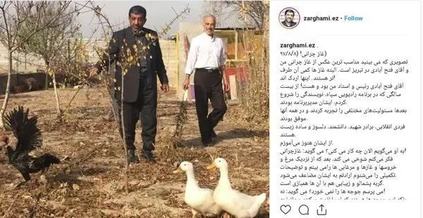 تصویری که می بینید مناسب ترین عکس از غاز چرانی من و آقای فتح آبادی در تبریز است. البته غازها کمی آن طرفتر هستند. اینها اردک اند! آقای فتح آبادی رئیس و استاد من بود و هست! از بیست سالگی که در برنامه رادیویی سپاه، نویسندگی را شروع کردم، ایشان مدیربرنامه بودند. بعدها مسئولیتهای مختلفی را تجربه کردند و در همه آنها موفق بودند. فردی انقلابی، برادر شهید، دانشمند، دلسوز و ساده زیست هستند. از ایشان هنوز میآموزم. به او میگویم الان چه کار می کنی؟ می گوید: غازچرانی! فکر میکنم شوخی می کند، بعد که از نزدیک مرغ و خروسها و غازها و مرغابی ها را میبینم و توضیحات تکمیلی را میشنوم ارادتم به ایشان مضاعف میشود.