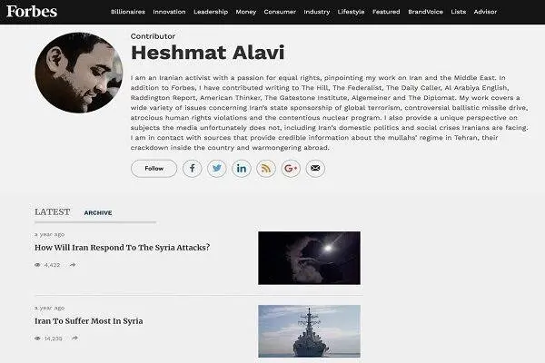 در طول سال ۲۰۱۷-۲۰۱۸ با اسم حشمت علوی بیش از ۶۰ مقاله در فوربس منتشر شده و حتی کاخ سفید نیز در پاسخ به خبرنگاران به گزارش‌های این فرد تقلبی استناد کرده است.