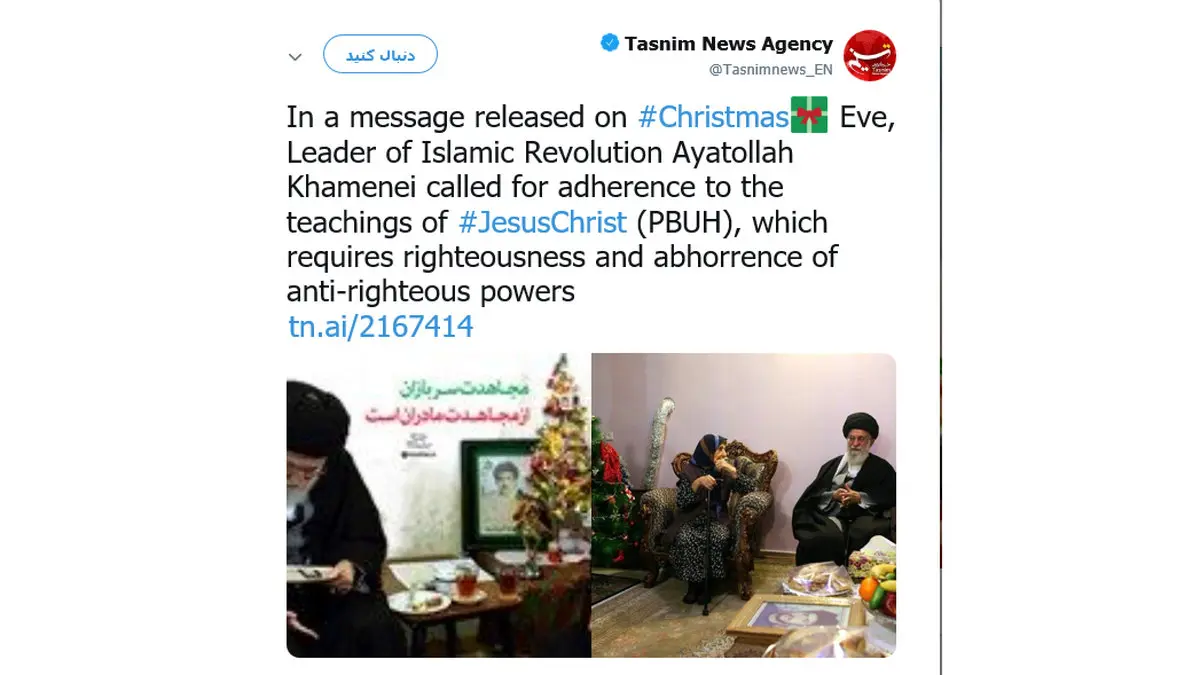 به گزارش رکنا، به نقل از اسپوتنیک، در پیام منتشر شده در توئیتر تسنیم در شب کریسمس، رهبر معظم انقلاب خواستار پیروی از تعالیم حضرت مسیح شد که این امر مستلزم عدالت و خروج قدرت های ضد عدالت است.
