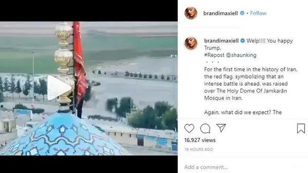 برندی مکسیل بازیگر و مجری تلویزیون آمریکا با انتشار ویدئویی از اهتزاز پرچم سرخ بر مسجد مقدس جمکران با طعنه ترامپ را زمینه ساز جنگی میان ایران و آمریکا خواند. او در متن پست اینستاگرام خود نوشت: