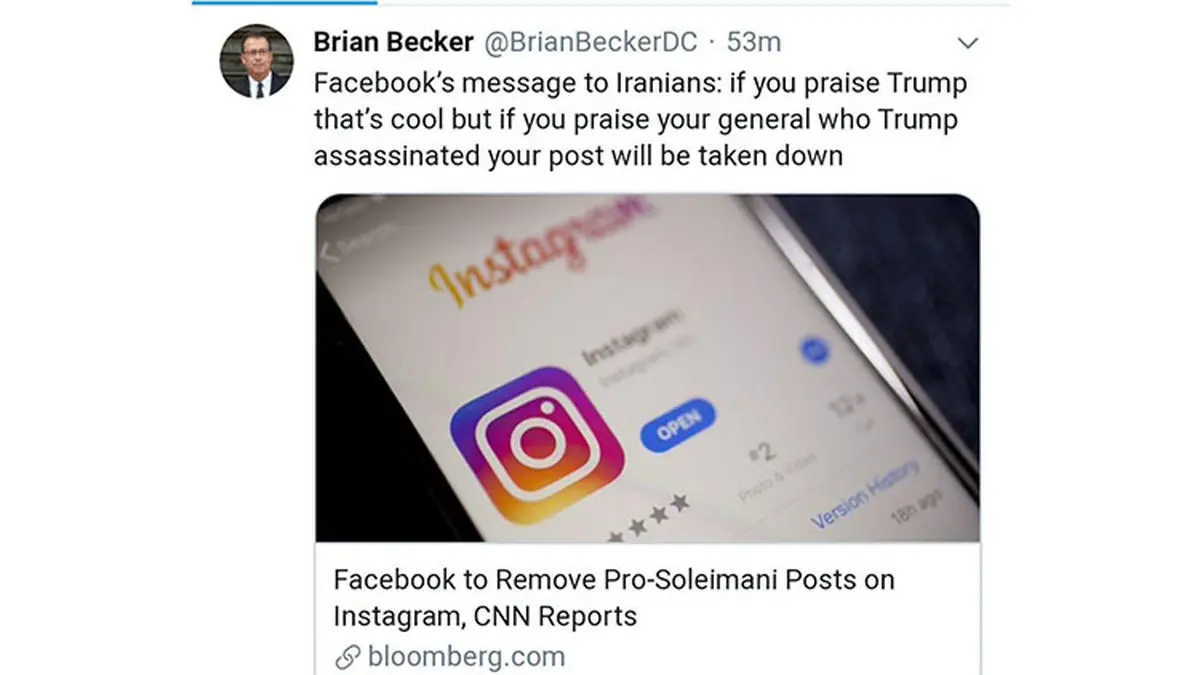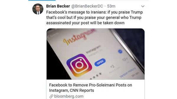 به گزارش رکنا، به نقل از افکارنیوز، این فعال سیاسی نوشت: «پیام (شرکت) فیس‌بوک به ایرانی‌ها این است که اگر ترامپ را ستایش کنید، مشکلی نیست، اما اگر ژنرالتان ( سردار سلیمانی ) را ستایش کنید که ترامپ ترور کرده، عکس‌ها و پُست‌هایتان حذف خواهد شد.»