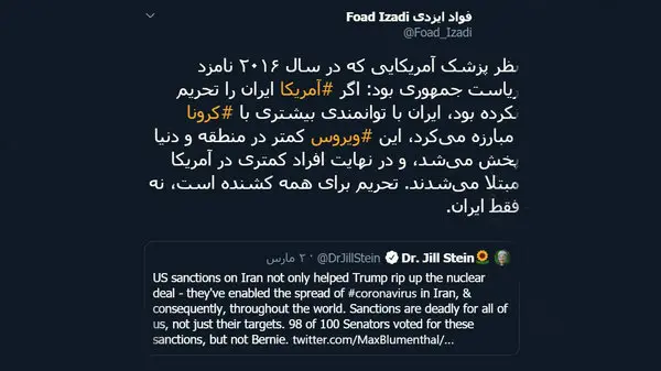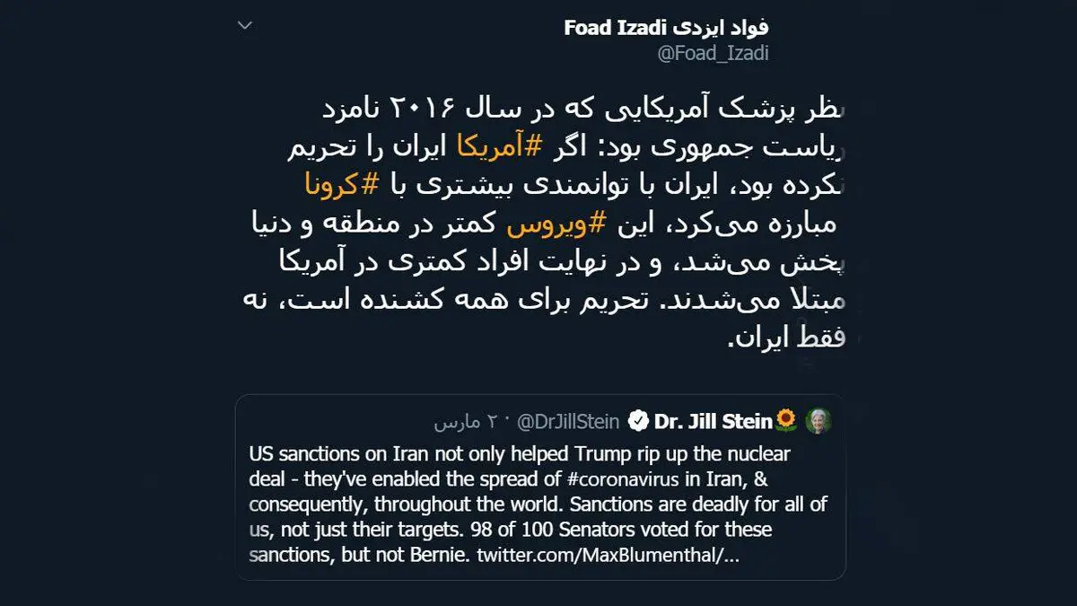 رکنا: فواد ایزدی تحلیلگر مسائل بین الملل در صفحه شخصی خود درتوییتر نظر پزشک و نامزد ریاست جمهوری آمریکا درباره تحریم ایران و شیوع کرونا را منتشر کرد.