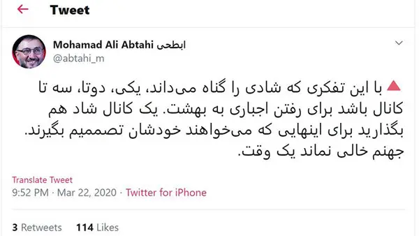 کنایه تند ابطحی به صدا وسیما: یک کانال جهنمی و چند کانال بهشتی !