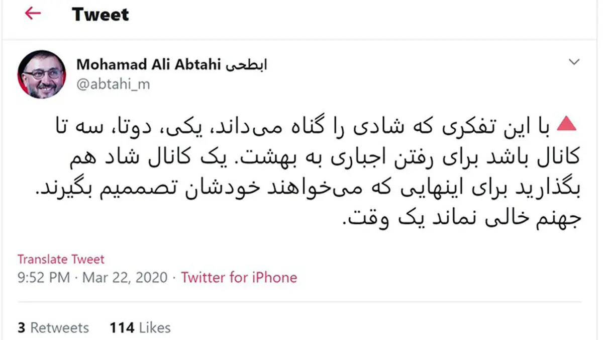 به گزارش رکنا، سید محمدعلی ابطحی در صفحه توییتری خود به برنامههای صدا و سیما کنایه زد و نوشت: «با این تفکری که شادی را گناه میداند، یکی، دوتا، سه تا کانال باشد برای رفتن اجباری به بهشت. یک کانال شاد هم بگذارید برای اینهایی که میخواهند خودشان تصممیم بگیرند. جهنم خالی نماند یک وقت.»برای ورود به کانال تلگرام ما کلیک کنید.