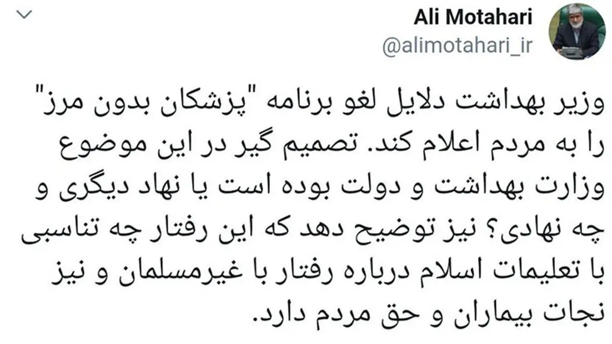 علی مطهری نماینده مردم تهران در مجلس شورای اسلامی به لغو حضور پزشکان بدون مرز در ایران انتقاد کرده و خواستار شفاف سازی در این زمینه شده است. او در توییتی نوشته است: وزیر بهداشت دلایل لغو برنامه پزشکان بدون مرز را به مردم اعلام کند. تصمیم گیر در این موضوع وزارت بهداشت و دولت بوده است یا نهاد دیگری و چه نهادی؟