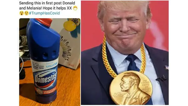به گزارش رکنا، شهروندان آمریکایی در واکنش به خبر ابتلای دونالد ترامپ، رئیس جمهوری کشورشان و نیز همسرش در صفحه توئیتر و دیگر شبکه های اجتماعی خطاب به او توصیه کردند که طبق تاکید قبلی او به مبتلایان به کرونا، مواد شوینده بنوشد که در رفع کرونا معجزه می کند.