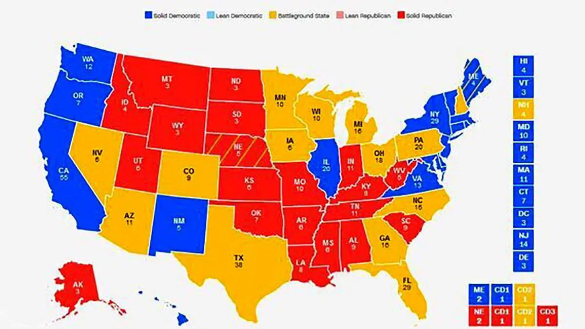 به گزارش رکنا، بر اساس نقشه‌ای که در ذیل آمده است، ایالت‌های آبی به طور سنتی طرفدار دموکرات‌ها، ایالت‌های قرمز به طور سنتی و پیش فرض طرفدار جمهوری‌خواهان و ایالت‌های زرد محل اصلی رقابت بایدن دموکرات و ترامپ جمهوری‌خواه هستند.