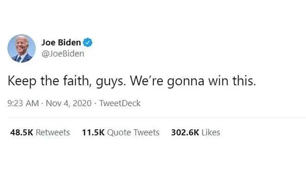 به گزارش رکنا، جو بایدن در توییتر نوشت: بچهها مطمئن باشید ما برنده میشویم.برای ورود به کانال تلگرام ما کلیک کنید.
