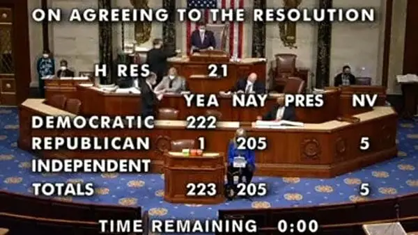 به گزارش رکنا، این قطعنامه که شامگاه سه‌شنبه با ۲۲۳ رای موافق و ۲۰۵ رای مخالف به تصویب رسید، از مایک پنس و هیات وزیران آمریکا درخواست می‌کند با اعمال متمم ۲۵ قانون اساسی، از دونالد ترامپ سلب اختیار کند و مسئولیت دولت را در اختیار پنس قرار گیرد.
