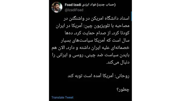 به گزارش رکنا، فواد ایزدی، تحلیلگر سیاسی در توییتر نوشت استاد دانشگاه امریکن در واشنگتن در مصاحبه با تلویزیون چین گفت که آمریکا در ایران کودتا کرد، از صدام حمایت کرد، ده‌ها سال است که آمریکا سیاست‌های بسیار خصمانه‌ای علیه ایران داشته و دارد، الان هم بایدن سیاست ضد چینی، روسی و ایرانی را دنبال می‌کند.