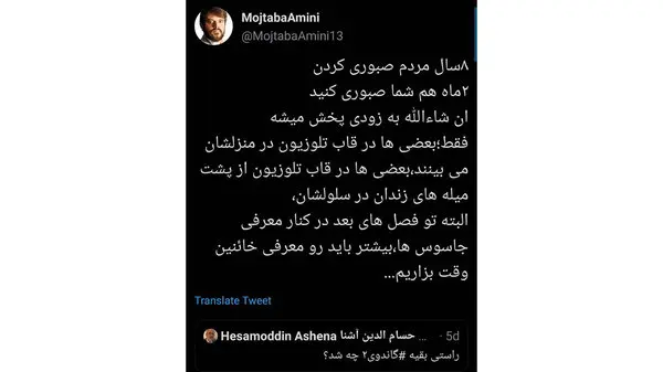 به گزارش رکنا ، مجتبی امینی تهیه کننده سریال گاندو در پاسخ به توییت آشنا طی توییتی نوشت: ۸سال مردم صبوری کردن2ماه هم شما صبوری کنید