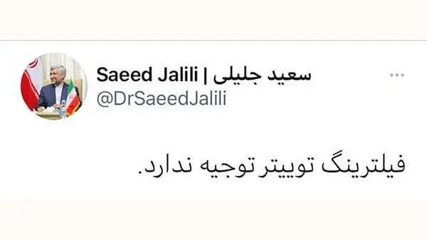 به گزارش رکنا ، سعید جلیلی نامزد انتخابات ریاست جمهوری در صفحه شخصی خود در فضای مجازی نوشت: فیلترینگ « توییتر » توجیه ندارد.
