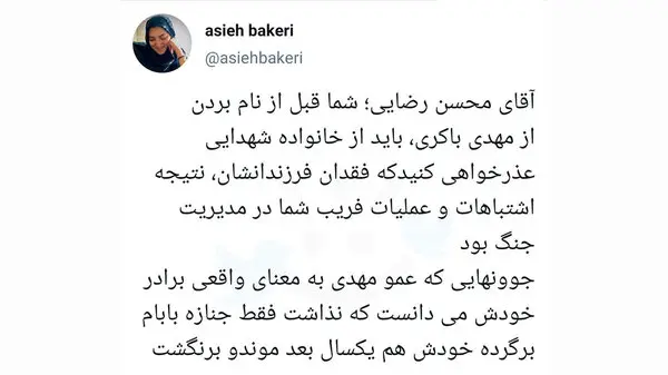 پاسخ تند دختر شهید باکری به محسن رضایی