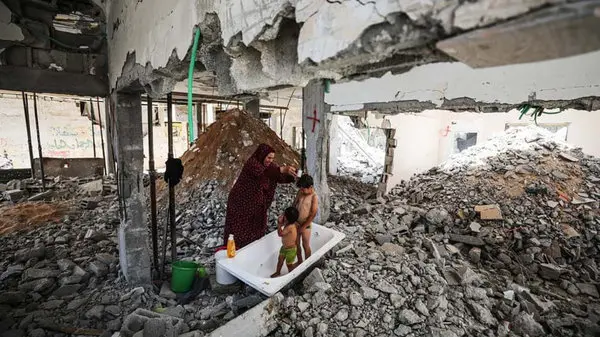استحمام کودکان فلسطینی در بین آوارها را مشاهده کنید.