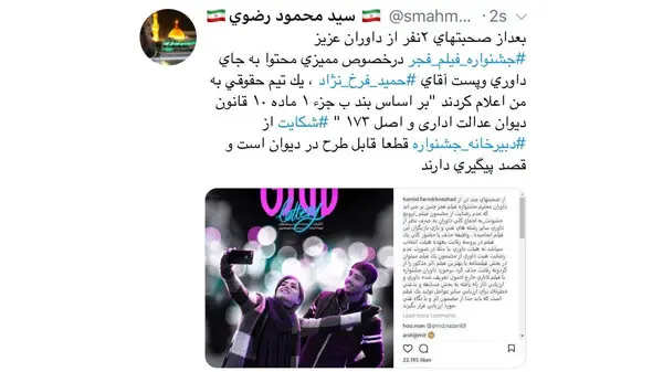 محمود رضوی تهیهکننده فیلم سینمایی Movie «لاتاری» در صفحه توییتر خود نوشت: «بعداز صحبتهای ٢ نفر از داوران عزیز جشنواره فیلم فجر درخصوص ممیزی محتوا به جای داوری و پست آقای حمید فرخ نژاد، یک تیم حقوقی به من اعلام کردند بر اساس بند ب. جزء ۱ ماده ۱۰ قانون Law دیوان عدالت اداری و اصل ۱۷۳ شکایت از دبیرخانه جشنواره قطعاً قابل طرح در دیوان است و قصد پیگیری دارند.»برای ورود به کانال تلگرام ما کلیک کنید.