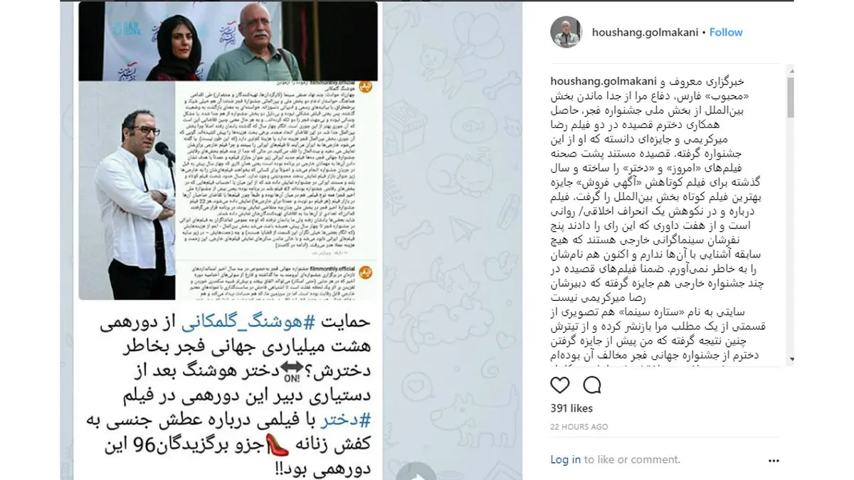 در متن این پست که با تیتر «هوشنگ گلمکانی از دورهمی هشت میلیاردی جهانی فجر به خاطر دخترش؟» آمده: «دختر هوشنگ بعد از دستیاری دبیر این دورهم در فیلم دختر، با فیلمی درباره عطش جنسی به کفش زنانه، جزو برگزیدگان 96 این دورهمی بود».