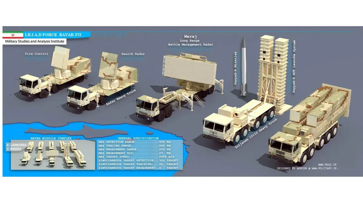 به طرز شگفتآوری، موشکهای «باور 373» و «اس-300» به طور موفقیتآمیز پهپادهای اسرائیلی و برخی موشکها را هدف قرار دادند. بیایید نگاهی سریع به «باور 373» بیندازیم. این سیستم از موشکهایی استفاده میکند که در دو کانتینر راهانداز مستطیلی قرار دارند و دارای یک سیستم راداری آرایه فازی برای ردیابی هر دو هدفهای آئرودینامیک و موشکهای بالستیک در فواصل متوسط تا طولانی است. یکی از رادارهای مورد استفاده در «باور 373»، رادار «معراج» است که میتواند تا 450 کیلومتر را پوشش دهد و ایران ادعا میکند که این سیستم میتواند به طور همزمان تا 200 هدف را ردیابی کند.