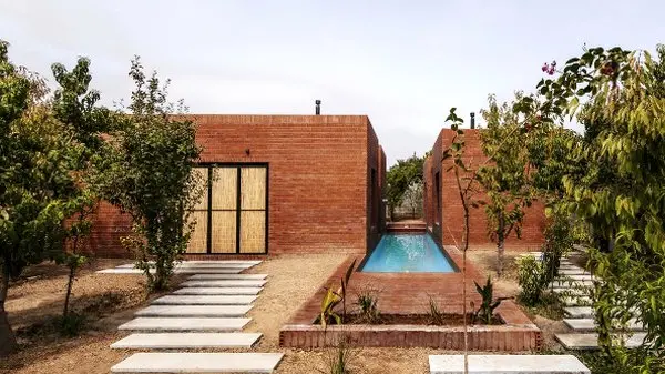 کنار هم قرار گرفتن حجم های آجری در یک منطقه پنهان به دنبال ارج نهادن به کیفیت اصیل مواد طبیعی است و رابطه بین انسان و طبیعت را در طول زمان برجسته می کند. ویلای میان مرز از آجر اُخرایی ساخته شده است که پالت چشم انداز اطراف را تکمیل می کند: آسمان آبی، پوشش گیاهی سبز، زمین شنی زرد، و در نهایت یک خانه قرمز.