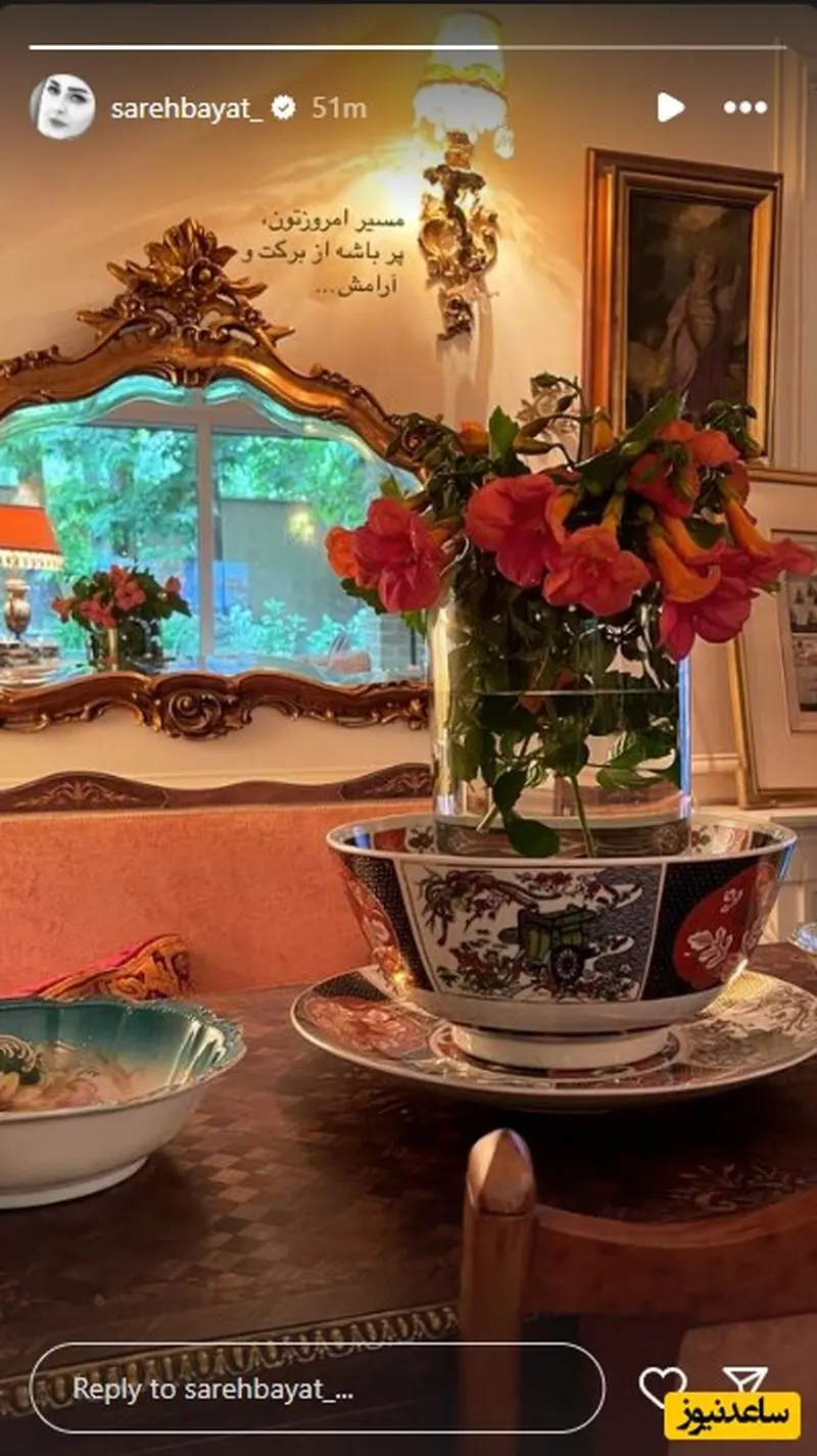 دکوراسیون خانه لوکس و پُر از عتیقه جات ساره بیات از آینه کنده کاری شده با کاسه بشقاب گران قیمت و قدیمی