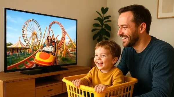 این پدر، فرزند خود را درون یک سبد میوه قرار داده و او را مقابل تلویزیون نشاند. سپس با پخش ویدیویی از حرکت ترن، فضای هیجانانگیزی ایجاد کرده که کودک تجربهای مشابه سوار شدن بر ترن واقعی داشته باشد.