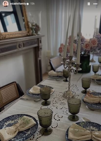 نگاهی به دیزاین شیک و زیبای میزغذای همسر شاهرخ استخری با بشقاب قلم آبی و لیوان های نوستالژیک مادربزرگ ها
