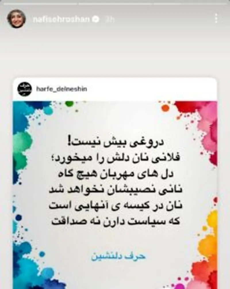 استوری پرحاشیه نفیسه روشن : دروغی بیش نیست ... نان در کیسه آن هایی است که سیاست دارند... نه صداقت...