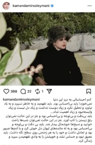 کمند امیرسلیمانی ، بازیگر مطرح سینما و تلویزیون، با انتشار یک دلنوشته تأملبرانگیز و تا حدی غمگین در فضای مجازی، فضای مجازی را تحت تأثیر قرار داد و واکنشهای بسیاری را برانگیخت.