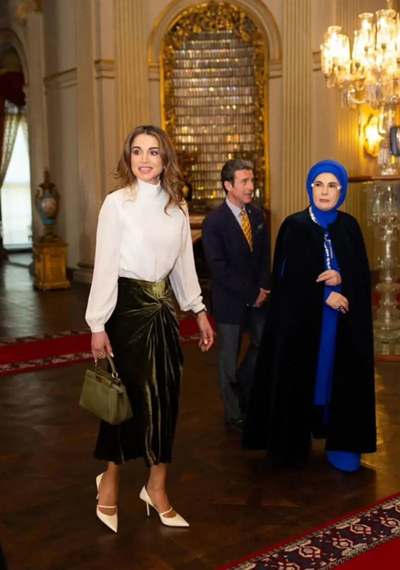 ملکه رانیا با انتشار تصاویری از این دیدار، با اشاره به میزبانی ترکیه، از «گرمی استقبال و مهمان نوازی» قدردانی کرد و اعلام کرد این ملاقات در چارچوب همراهی او با پادشاه اردن در این سفر رسمی صورت گرفته است. رانیا در این سفر سیاسی، پالتوی بلند کله غازی رنگش را با شومیز شیک یقه ایستاده سفید رنگش ست کرده بود و زیر آن دامنی مخمل و بسیار شیک به رنگ سبز به تن کرده بود. جذابیت این استایل رانیا را کیف سبز او تکمیل میکرد.