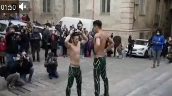 به گزارش رکنا، این دو نفر‌، سر به سر و بدون تماس دست، 100 پله رو در 53 ثانیه بالا میروند. این حرکت حاکی از تمرین های زیادی است که این دو مرد جوان انجام داده است.