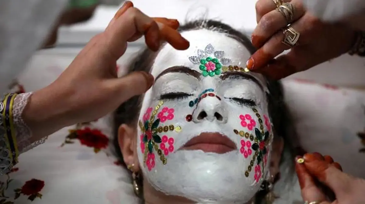 نکته قابل توجه این مراسم آرایش روی صورت عروس است. چهره او با رنگ سفید گچی و ضخیم پوشانده شده و با پولکهای رنگارنگ تزئین شده است.