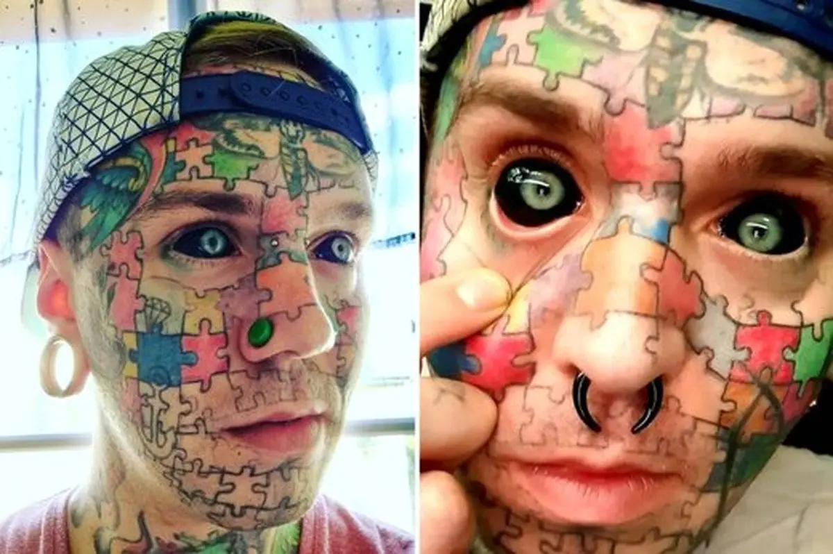 رکنا:فردی که علاقه افراطی به خالکوبی دارد ۱۲۵۰۰ پوند برای خالکوبی صورت و حتی تخم چشمانش هزینه کرده تا ظاهری شبیه به پازل پیدا کند.