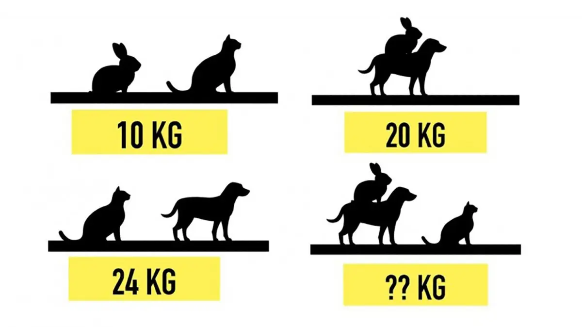 برای حل مسئله دوم، باید وزن سگ، گربه و خرگوش را مشخص کنید. اطلاعات موجود در تصویر برای یافتن راه حل کافی است. میتوانید؟