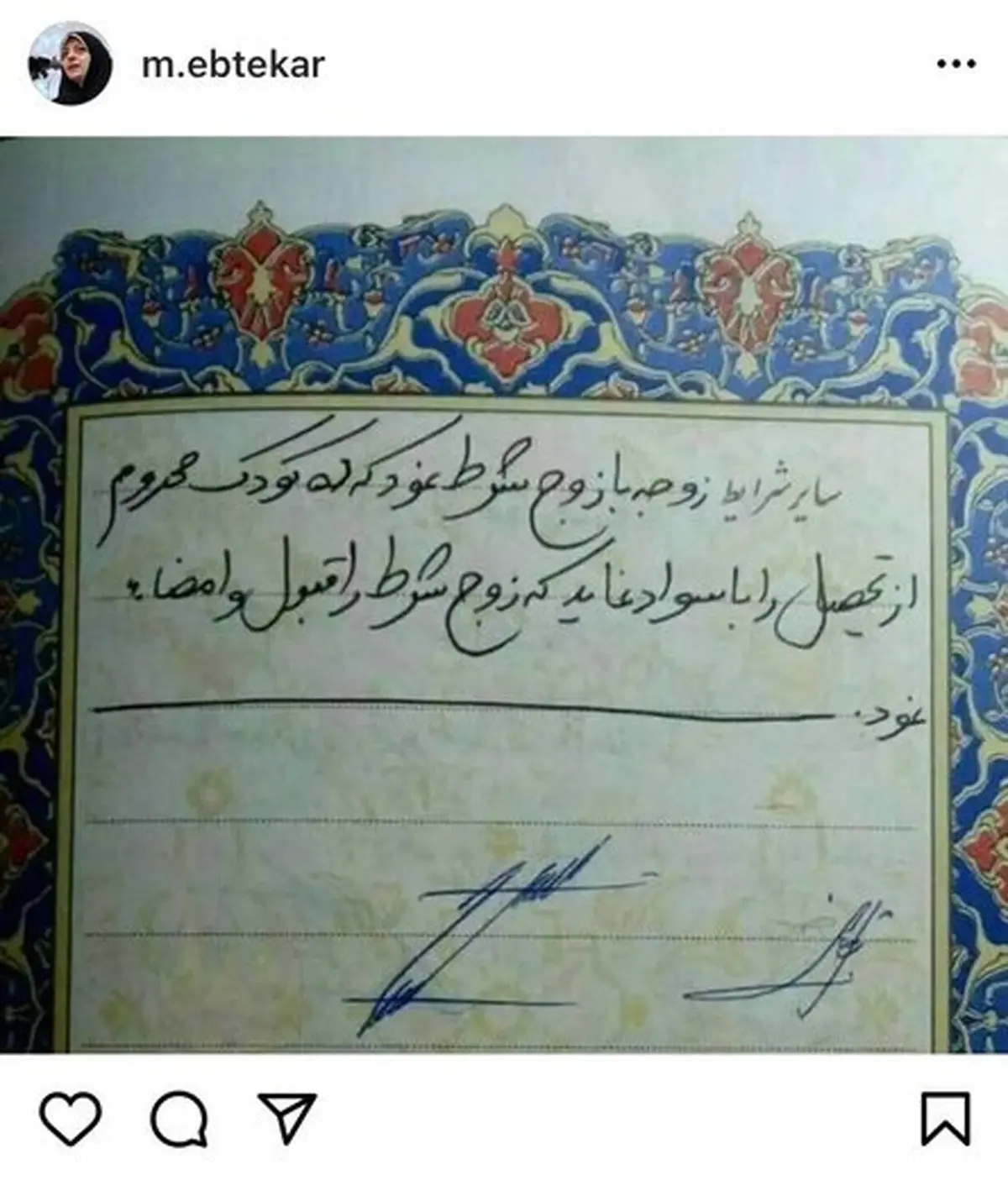 به گزارش رکنا، معصومه ابتکار، معاون سابق زنان و امور خانواده رییس جمهور در صفحه اینستاگرام خود عکسی از یک عقدنامه عروس و دامادی را منتشر کرد که را آن با شرط ازدواج عجیبی نوشته شده است.