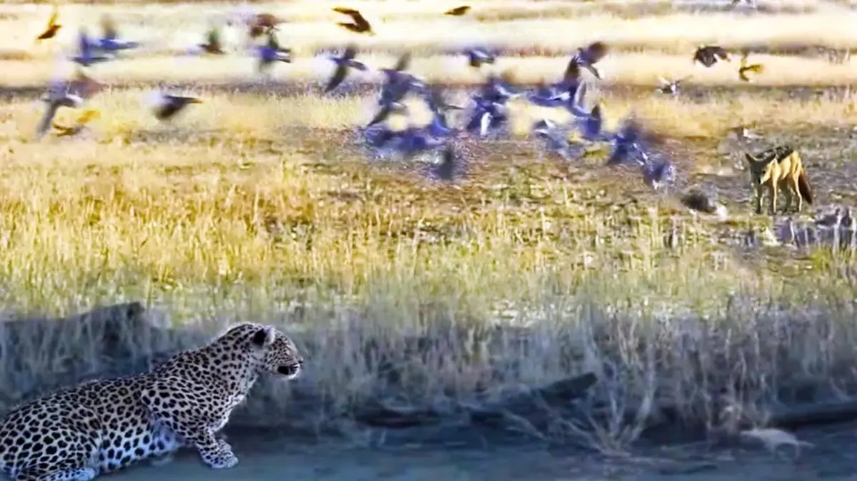 کبوتر ها برای فرود آمدند و دو شغال به امید لذت بردن از صبحانه زودهنگام برای رهگیری و تعقیب آماده شدند. چیزی که آنها نمیدانستند این بود که منوی غذای یک شکارچی دیگر بسیار متفاوت از غذای آنها بود. یکی از شغالها چند بار تلاش کرد. در حالی که پلنگ در بوتهزار دراز کشیده بود.