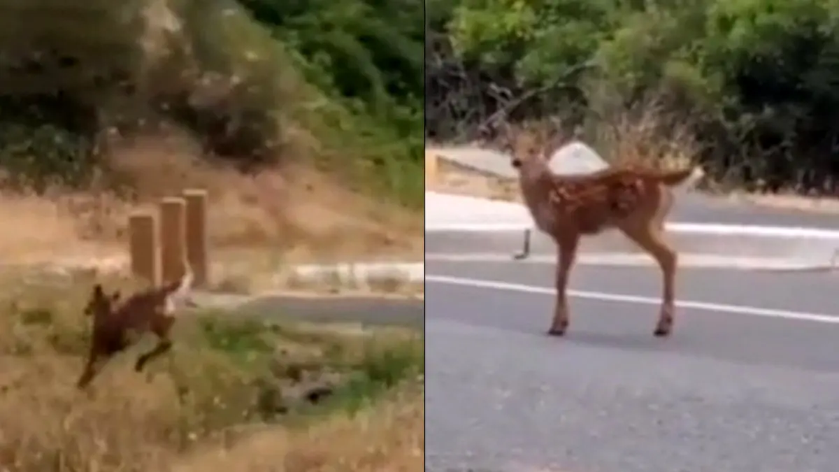 به گزارش رکنا، یک بچه آهو در حال دویدن با شتاب در جاده جنگلی پشت سر مادرش بوده است که ناگهان وقتی می خواهد از عرض جاده عبور کند متوجه حضور انسان و دوربین می شود. اندکی مکث و توقف می کند و بعد خیلی آرام و آهسته و با احتیاط از جاده عبور می کند. جالب است که وقتی می تواند خود را به سمت دیگر جاده برساند مجددا با شتاب به دنبال مادرش می دود.