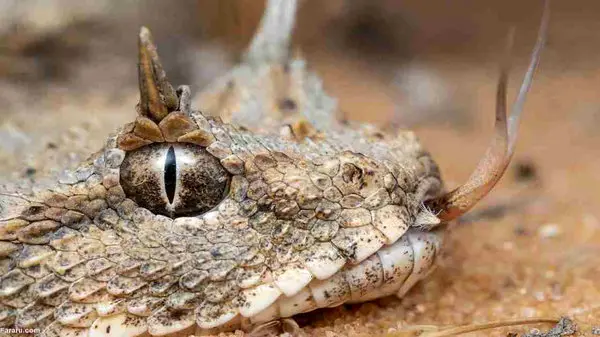 "یکی از عجایب خلقت که فقط در ایران زیست میکند. افعی دم عنکبوتی انتهای دمش شبیه عنکبوت هست و باعث می شود پرندهها فریب بخورند و وقتی برای شکارش حمله می کنند خودشان طعمه افعی شوند! این افعی با تکامل شگفت انگیزش همه را حیرت زده کرده است. زیستگاه این افعی در استان ایلام است."